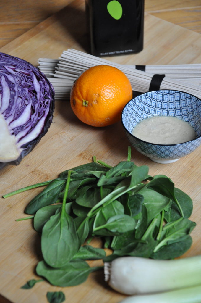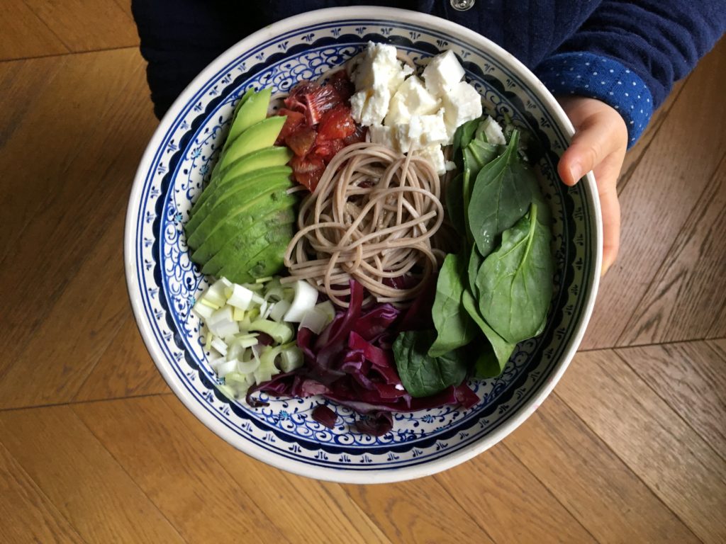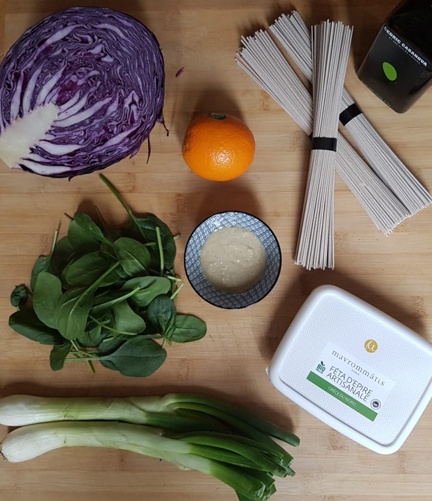 Nous avons choisi d’associer les nouilles soba avec de l’avocat (riche en acide folique et en vitamine E), du chou rouge (riche en vitamine K et peu calorique), des épinards (source d’anti-oxydants) et de l’orange pour ajouter un peu de peps. La feta, quand à elle, apporte un coté un peu plus gourmand à votre bowl.
